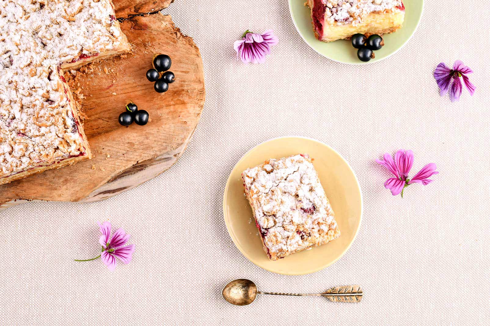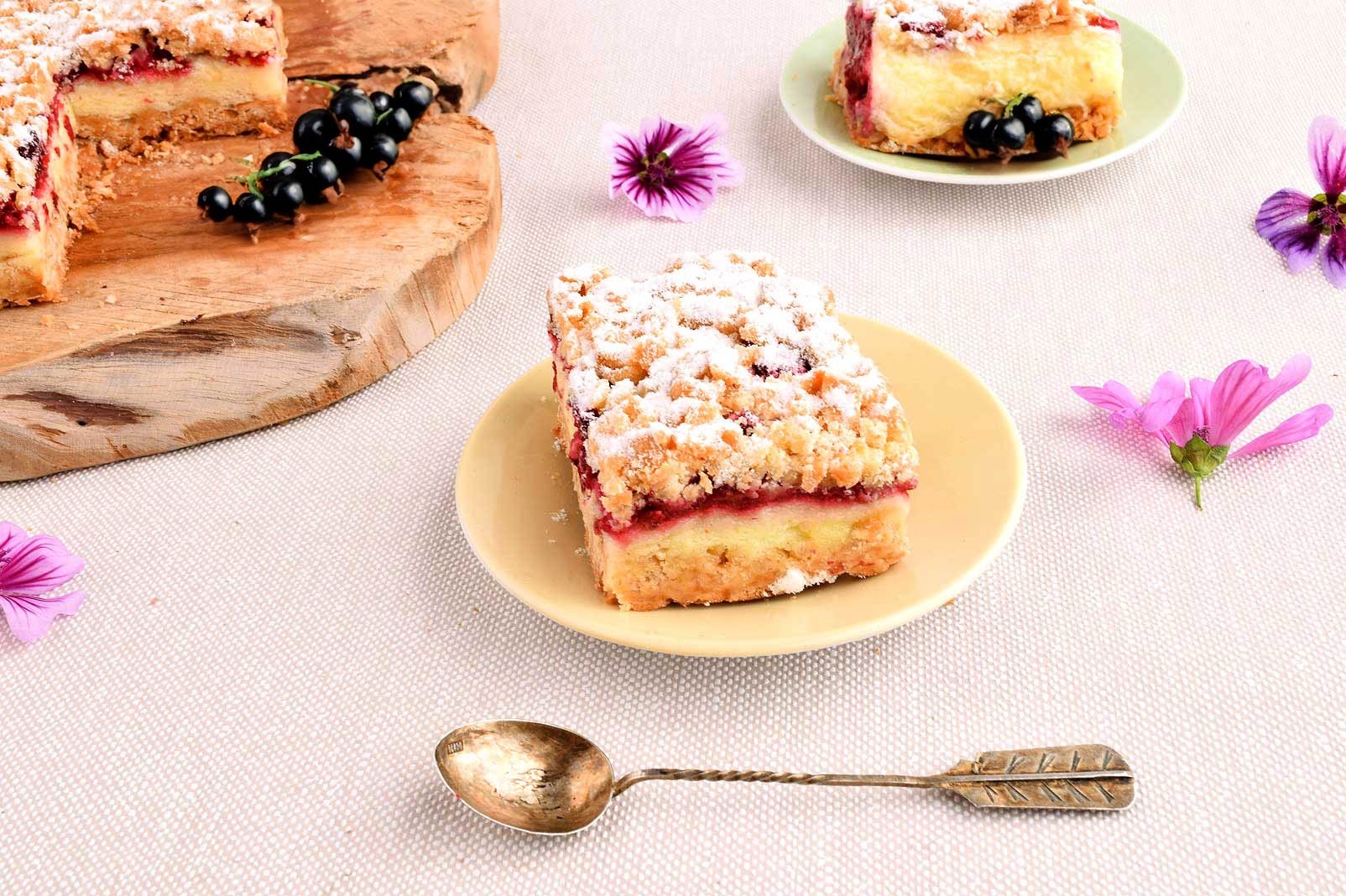 Tradycyjne, lekkie kruche ciasto idealnie zbalansowane dzięki słodyczy budyniowej pianki i kwaskowości świeżych porzeczek.