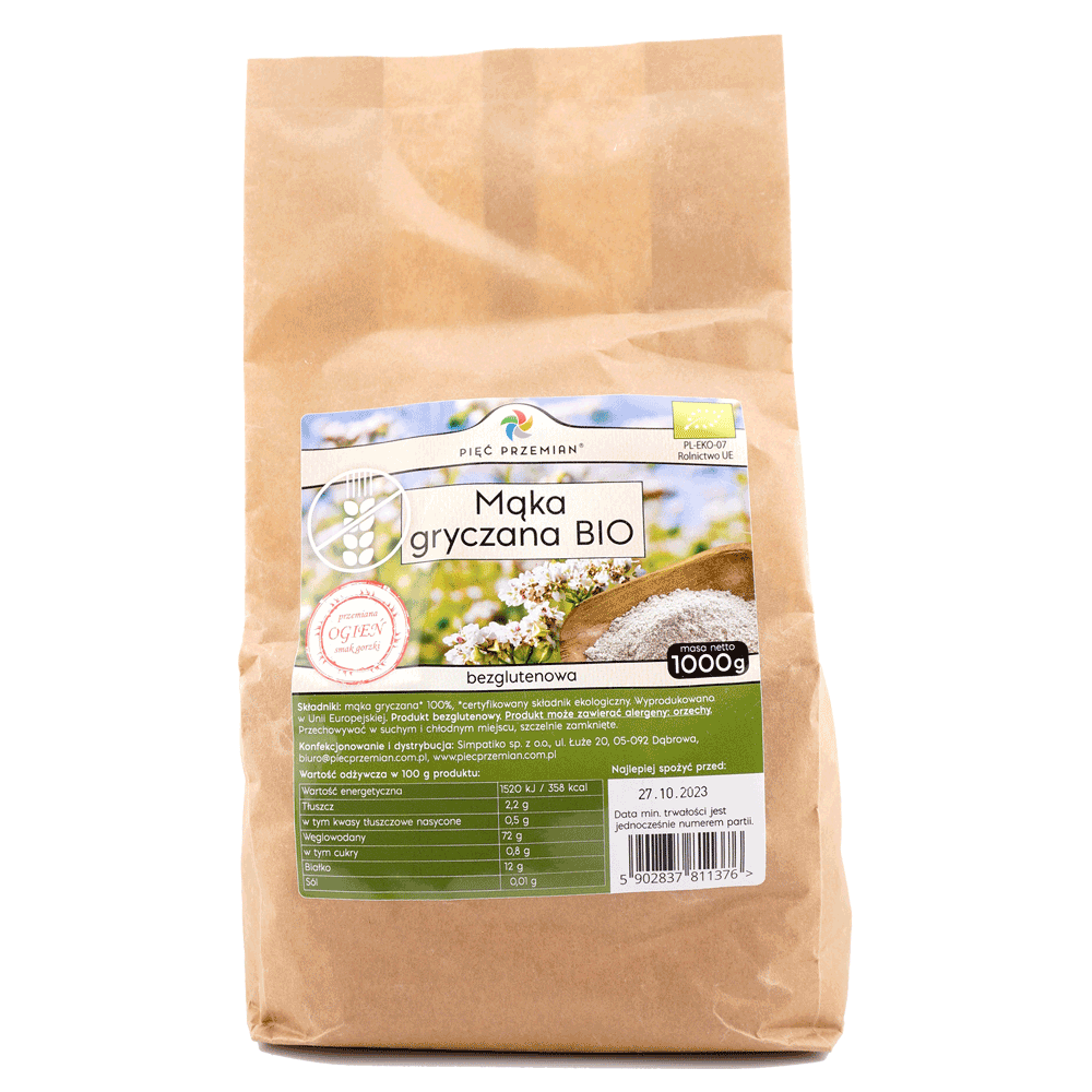 Mąka gryczana BIO bezglutenowa 1000 g jest idealnym dodatkiem do potraw dla alergików i osób z wrażliwymi jelitami. Została wyprodukowana z najwyższej jakości ziaren gryki ekologicznej wyróżnionej certyfikatem BIO. Jest źródłem białka, nienasyconych kwasów tłuszczowych i zdrowych węglowodanów. Ponadto dostarcza witamin i składników mineralnych takich jak magnez, potas, żelazo i cynk. Mąka gryczana jest w 100% bezglutenowa. Produkt jest doskonałym uzupełnieniem codziennej diety i idealnym dodatkiem do pierogów, placków, ciast, klusek i innych potraw. Mąka gryczana posiada niski indeks glikemiczny, co sprawia, że mogą jej używać diabetycy oraz osoby z podwyższonym poziomem glukozy we krwi. Wyśmienita jakość produktu i wyjątkowy smak są gwarancją zdrowia i wielu pozytywnych wrażeń smakowych.