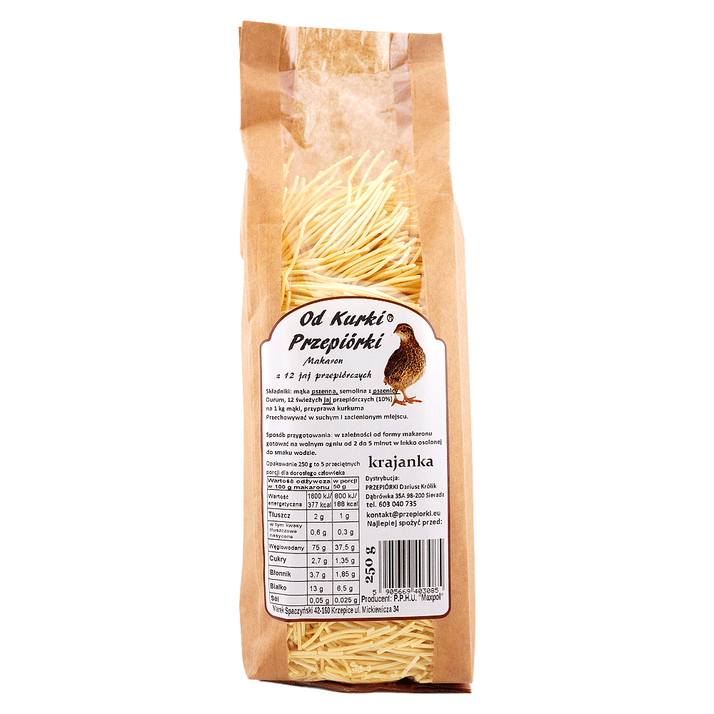 Makaron z 12 jaj przepiórczych to propozycja dla miłośników wysokiej jakości i wyjątkowego smaku w kuchni. Charakteryzuje się delikatnym, kremowym smakiem, który zawdzięcza dodatkowi jaj przepiórczych. Ten rodzaj makaronu idealnie nadaje się do przygotowania różnego rodzaju dań, może być używany jako dodatek do zup lub jako składnik dań głównych.