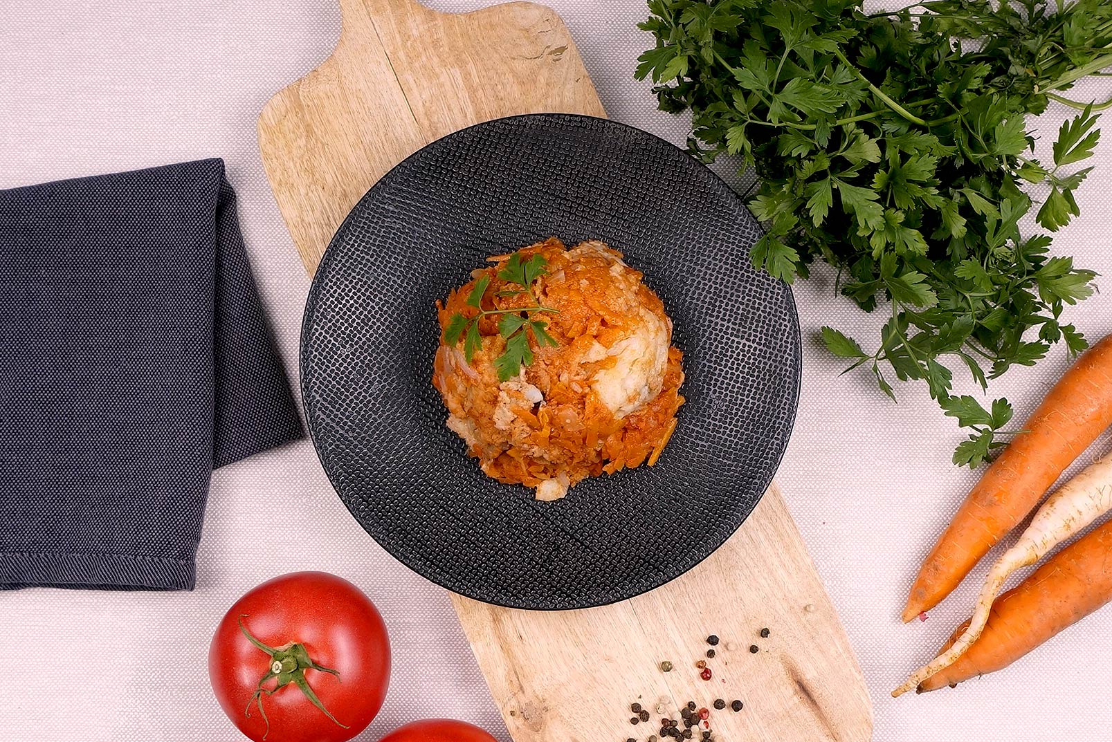 dorsz, marchew, pietruszka, seler, cebula, pomidory, sól, pieprz, liść laurowy, ziele angielskie