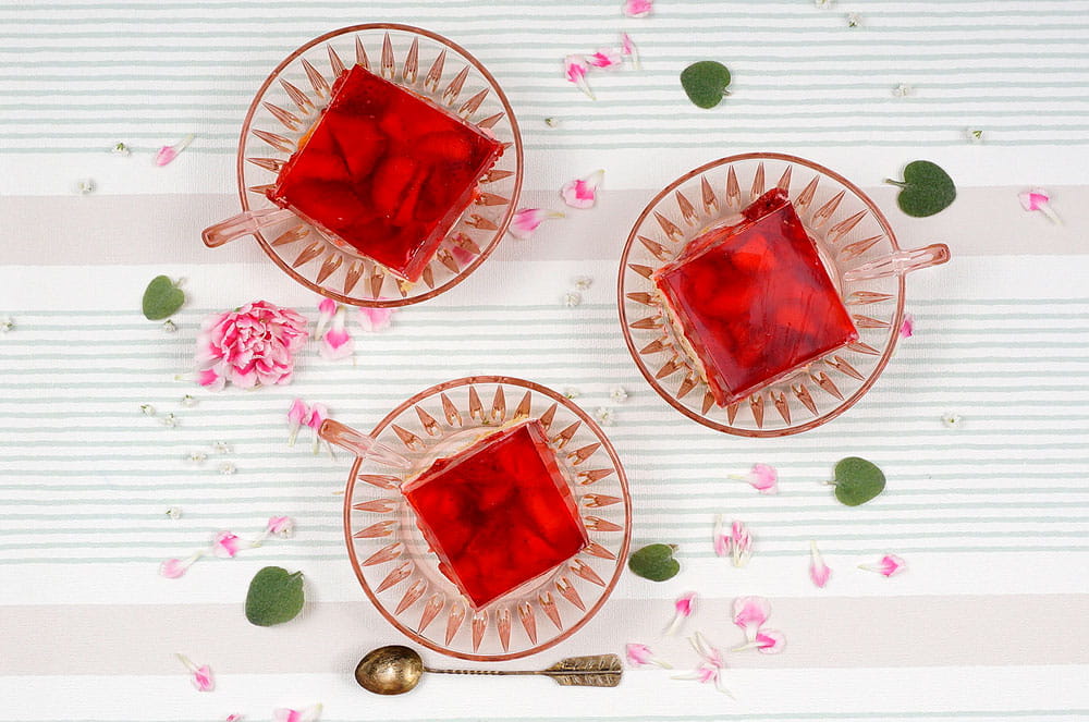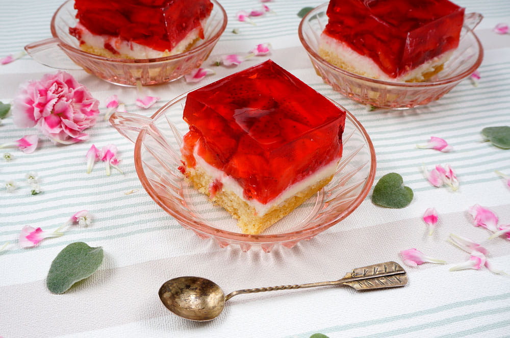 Jednak prawdziwą koronką tego deseru są owoce truskawek i brzoskwiń na szczycie. Zanurzone w błyszczącej galaretce, te soczyste owoce przywołują letnią świeżość na talerzu. To ciasto nie tylko zachwyca wyglądem, ale też oferuje niezwykłą przyjemność smakową, łącząc słodkość owoców z kremową konsystencją budyniu i delikatnością biszkoptu.