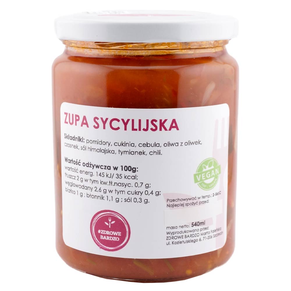 Ta zupa jest nie tylko doskonała w smaku, ale także dostępna dla osób bezglutenowych i wegan. Jej składniki to pomidory, cukinia, cebula, oliwa z oliwek, czosnek, sól himalajska, tymianek oraz delikatna nuta chili.